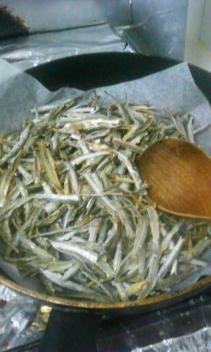 チャングム粉 ナニを隠そう、韓国ドラマ大好き!でして・・・ 一世を風靡した(?)チャングムの後半で、名もない庶民の 生活の知恵として紹介されたこのダシ粉を、のんびりできる 今ごろのシーズンに、毎年作ることにしています 材料は、煮干し、干し椎茸、昆布、干した大根の葉 煮干しは腹ワタを取り除き、身は頭と胴体にわけて 身は裂いておきます(これが第一のお手間いり) 昆布は細切り、椎茸は小さく割っておきます |