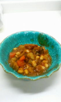 レンコンとゴボウを入れた、根菜類タップリのチリコンカン パブリカ、クミン、オレガノ、カイエンペッパーなどのスパイスを 入れたので、かなりヒリヒリ、スパイシーな味に |