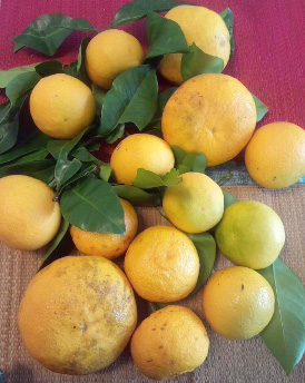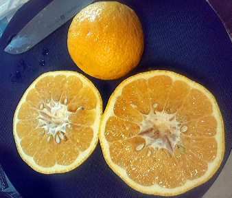 夏みかんほどの大きいのもあってびっくり! 割ってみるとまるでグレープフルーツみたいです 食べてみましたが、顔をしかめるほどには酸っぱくなくて グレープフルーツみたいにお砂糖をまぶせば食べられそうです |