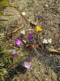 <クロッカス> そろそろいいかな、と出てきたのでしょうが 地面はまだまだ茶色くシーンとしていて なんだか寒そう 山の春はもうちょっと先きみたいです |