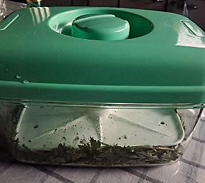 蓬に黒砂糖をまぶして漬け物器で圧縮しておきます 1週間くらいして黒い汁が上がってきたら瓶に移して 冷暗所で保存しておきます 500倍くらいに薄めて時々スプレーすると |