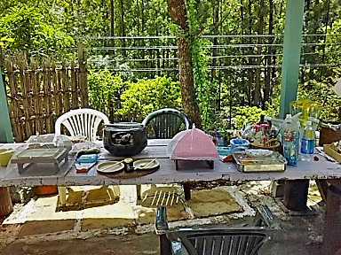 お客さまに焼き係をお願いして召し上がって頂いている間に 隣の窯で鶏を焼いたり、豌豆ごはんやお味噌汁を作ったり 卓上釜スタイルはなかなか便利(お客さまをお使い立てしてごめんなさい) |