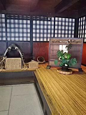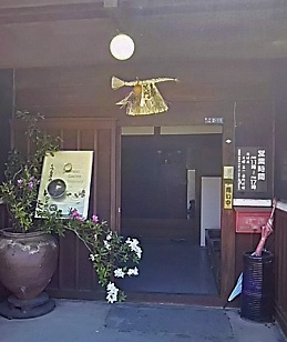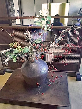 テレビで目にしたときよりずっと広くて立派な佇まいの玄関を入ると 年代物の大きな壷に古木が堂々と生けられています |