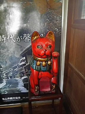 こちらは茶店のほかに 骨董品屋さんもやっておられ(骨董品屋さんのほうが主かも) 昭和レトロなティーカップやグラス、古い焼き物のお人形や 古布などを並べた棚があちこちに置いてあります このインパクトのある紅い招き猫 連れて帰りたくなりましたが・・・ 踏みとどまりましたー (=゚ω゚)ノ |