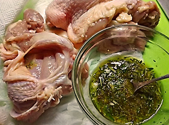 ローズマリーと鶏肉は相性抜群 ローズマリー(あればタイムとかオレガノとかマージョラムとかも)のみじん切りに レモンの絞り汁、塩、コショー、ニンニクすり下ろし、粒マスタードを混ぜた中に オリーブ油を少しずつ加えて混ぜてマリネード液を作っておきます それを鶏肉にすり付けるだけでもいいのですが 皮と肉の間に垂らし込むと ハーブの香りがしっかりとお肉につきます (残りの液はまわりにまぶしておきます) |