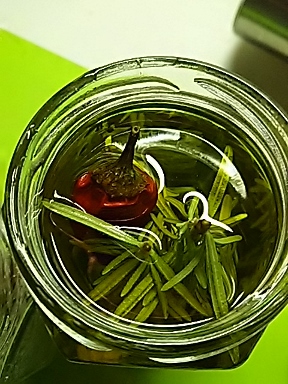 マリネード液を作るのが面倒なときは ハーブオイルを常備しておくのも便利ですよー さっと洗ってから水気をきちんと取ったローズマリーに 赤唐辛子、ちょっと潰したニンニクをオリーブ油に浸けておくだけ (ハーブが油から出ているとカビることがあるので油はたっぷりと!) 日光の直接当たらない場所に常温でおいておきます じゅうぶん香りが油に溶け込んだら、中のものは出してしまいます (2週間くらいかなー) お肉や野菜を炒めたり、ドレッシングにしたり |