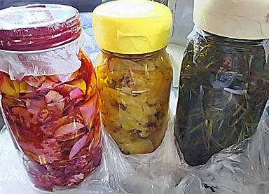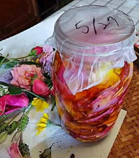 薔薇には色々な使い途があります オリーブオイルにたっぷりと浸けて石鹸やハンドクリームの材料に ひと足先に浸けこんである白いバラ「クーベルト」は ローズマリーと共にそろそろ石鹸を作ってもいい浸かり具合です |