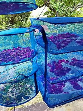 お茶にしても、お風呂に入れてもいいように 吊り篭で乾かしておきます 薔薇のお茶は疲れたときや気分が落ち込んだときに飲むと 神経をやさしくしずめて、明るく前向きな気分にさせるといいます |
