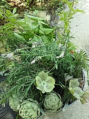高齢ながら一人で呉服屋を営む花好きの叔母に ハーブを届けました 今が最盛期のアーティチョークを中心にラベンダー、ローズマリー 花に見えて本当はガクだから・・・今の季節でも枯れないクリスマスローズ 他に野バラとレモンの葉っぱ |