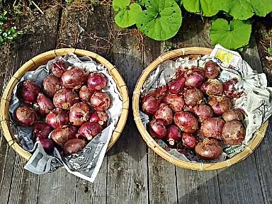 梅雨をねらったわけでもないのに あいにく梅雨の最中に掘り上げることになってしまう玉葱 とりあえず籠に入るだけを入れて乾かしました |