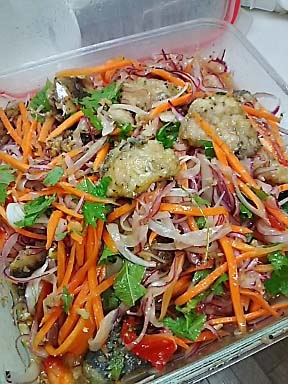 日保ちがするのでマリネをよく作ります (三日間は楽チンできるので ) この日は赤玉葱ドレッシングで玉葱、人参、鯵のマリネ |