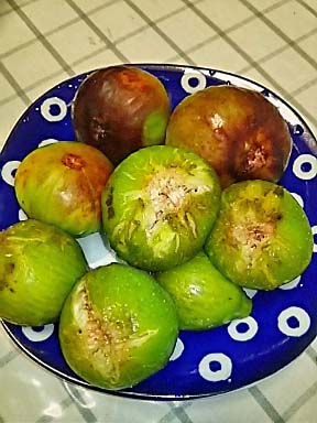 梅雨とガチンコするのは 無花果もそう 毎年鳥に食べられるので 早くからネットを被せた甲斐があって 今年は豊作みたいです うちのは外は緑色でも中は真っ赤な キングという種類が大半 ドルフィンと違って、キングは熟すと柔らかくて |
