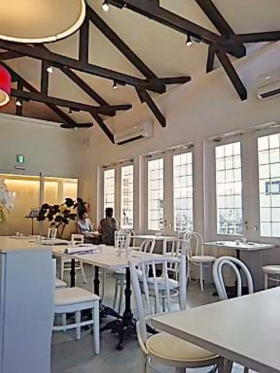 夏休みで遊んでいるおかげで お洒落なケーキ屋さんをみつけました♪ この白いカフェの他にとんがり帽子が可愛い テークアウトのケーキを販売する建物も建っています |