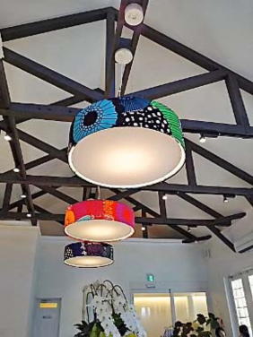 ポップな色と柄の 明かりのカバー 椅子に置かれた クッションとおんなじ |