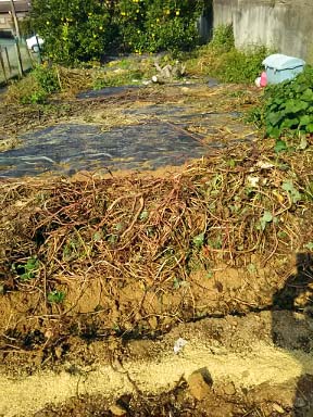 芋を振り上げたあとは耕して 有機肥料や糠を混ぜ込んで畦を高くした上に 芋の蔓で覆っておきました ニンニク用の場所作り! |