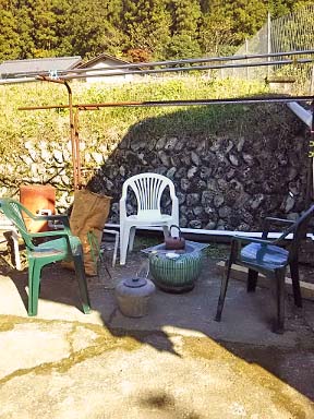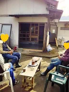 棟梁たちにとってお茶の時間は重要です 昼間は小春日和といえども山は朝晩冷え込みます 昔ながらの火鉢に炭を起して即席青空カフェ |