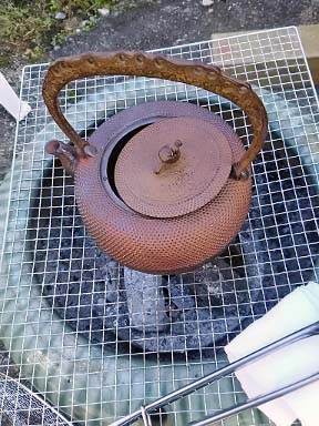 今日の野外料理のメインは味噌田楽 茶道具の釜をコンロ代りに使ってしまいました!(ゴメンナサイ!) |