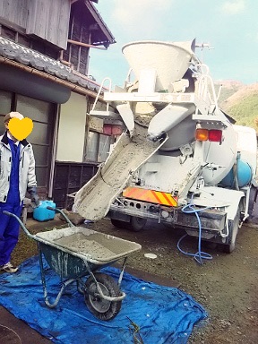 生コン車のドライバーさんをお待たせするので手早く運ばないと! 一輪車で運ぶジミ?な仕事も率先して手伝います |