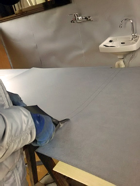 <鋼鈑切り> これもかねてから用意してあった鋼鈑切り専用の鋏 しかし、鉛筆で付けた印の上を正確に切るのはなかなか難しい・・・ ピンピンに張るのはもっと難しい! |
