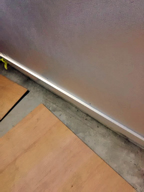 <水切り> こちらはプロの仕事 棟梁Mちゃんのお父さんの時代からある年代物のプレス機で 鋼鈑を曲げて床との境に「水切り」を作っていただきました (鋼鉄製の重厚な味のある親の代からのプレス機の写真を 撮り忘れましたので、また機会を設けてぜひm(__)m) |