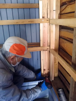 棟梁のMちゃんがお正月休みしている間に 弟子のBは宿題を幾つかこなさなくてはいけません 鋼板を張り付けるための土台の燦は 年末に仕上げてありましたが、 いざとなると様々な難問が! 特に隅っこの処理に苦労しています まず鋼板の釘を打つための添え木を打ち付けていきます |