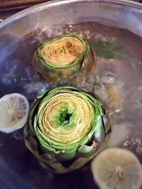 先っぽをちょっと切って レモンとローレルの葉っぱを入れて塩茹でして食べてみました これだけ大きいと台座の部分も大きくて食べ応えがあります |