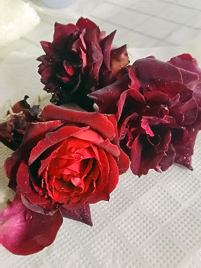 今ごろはまだ虫の被害にもあわず元気満々 深紅の薔薇フランシス デュプレイが 素晴らしい薫りを届けてくれました 薔薇のお茶にするために花びらをほぐして乾かしておきます (何でも食べちゃう) ![]() |