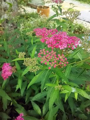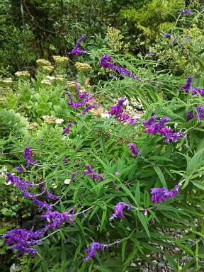 <西洋人参木> 花が終わると短く切ってしまう西洋人参木ですが 春の終わり頃からめきめきと枝を伸ばして こんなに旺盛に紫の穂状の花を見せてくれています |