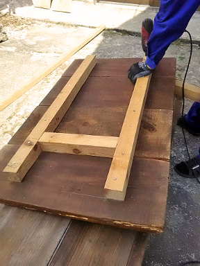 製材所を閉めた親戚のHちゃんの 旧工場の地下の機械室の蓋になっていた板を貰って 大事にとってあったのをテーブルの天板にして 外のテーブルを作りました |