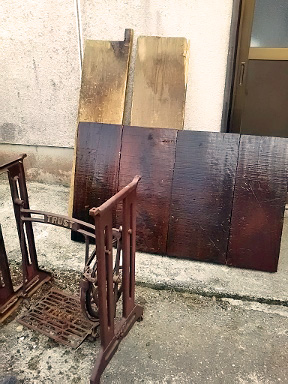 古いミシンの機械部分を外して テーブルの脚にしました 脚と天板は取り外しが利くようになっています |