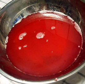 クタクタに煮たあと ゆすらないようにそぉーっと網で濾すと 透明感のあるルビー色の汁が残ります |