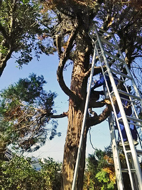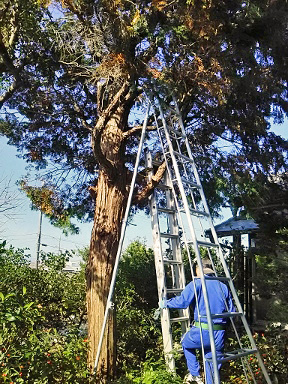 先ずは梯子の高さで下から順番に枝を払っていきます (左下から出ているように見える枝は落下する枝です) |