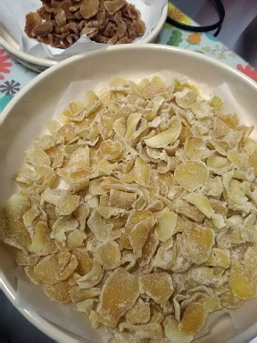 お砂糖を入れて水無しで煮詰めます 最後に砂糖が結晶すれば パリパリの生姜のお菓子の出来上り (茶色のはココア味 )そのまま食べても お茶に入れて残りを食べても |