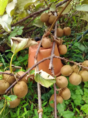 前の記事にも載せましたが、雄木として植えたヘイワードに 突如なりだした不思議なキーウイ?? かなりの大粒です 千手観音ほどの手がほしい? |