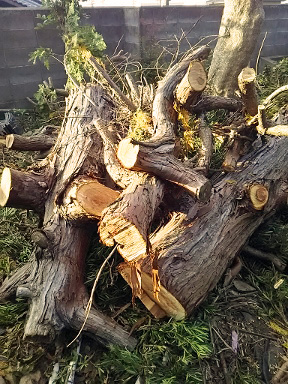 太い幹は水を含んで重くて運び出せません しばらく積んでおいて乾かしておきます 板にひくかマキにしてしまうか |