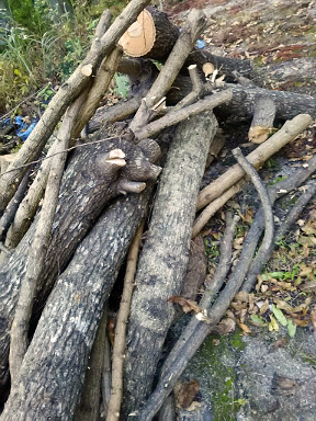 これは別の日に山の庭ルミノで切った椚の木 春になったら椎茸の菌を打つ予定です 最近はすっかり少なくなった椚 椎茸の台木として貴重な資源です |