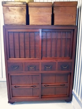 戦前の家具は蝶番や引手に なかなか味があります 底板が外れていたり釘がゆるんでいたりするので 少し修理がいりますが |