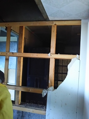 いよいよ、カナテコとハンマーを頼りに ぶっこわし作業に入りました 台所と隣の納戸の境の壁を |