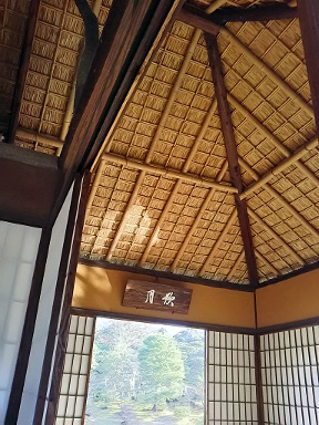 貴族たちの華やかな暮らし振りを物語って 邸内には峠の茶屋やら海辺の茶屋やらに見立てた建物や 月を愛でる茶室やらが設えられています これは天井を船底に見立てて建てられています ここから池に映る月を眺めたんですって |